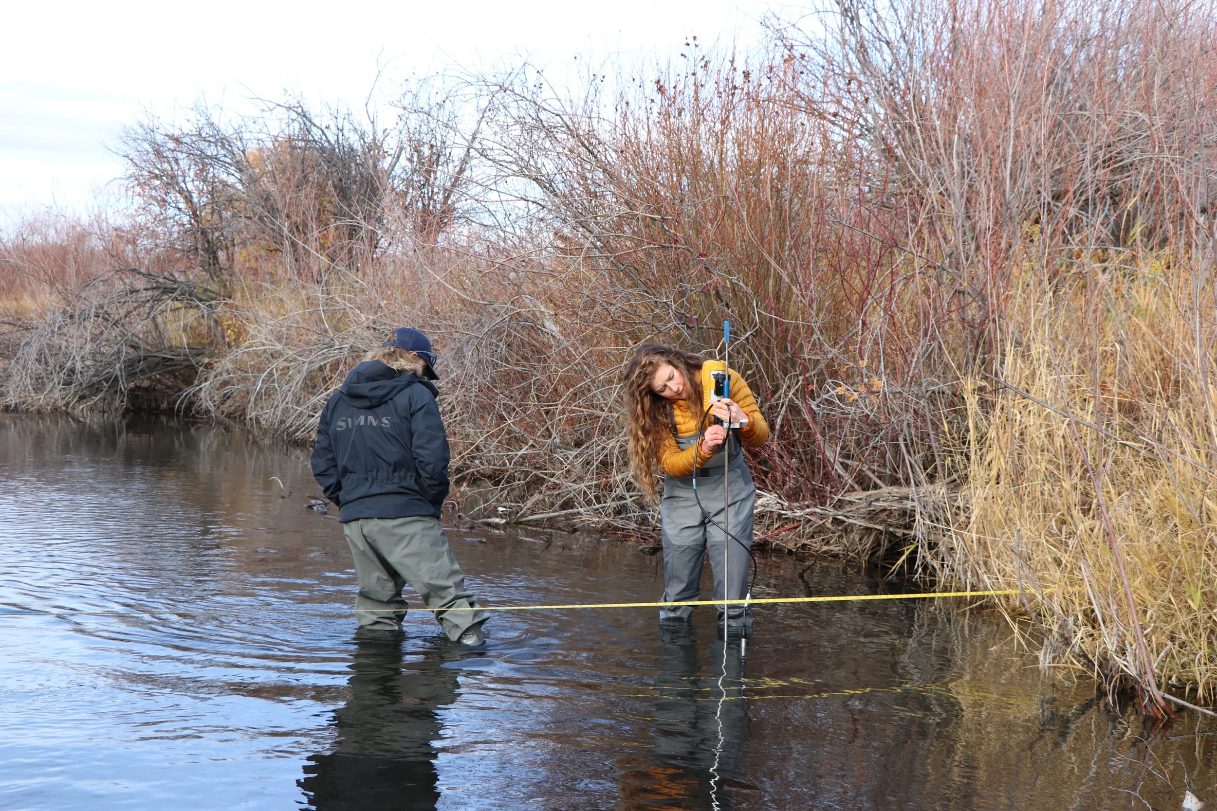 It's 9:00 a.m. on a chilly October morning, with snow threatening to fall, and Gallatin Stream Teams volunteers are gearing up for a day of stream monitoring. They pack waders, equipment for measuring streamflow and water quality data, a cooler for water samples, lunch, and, most importantly, hot coffee into the truck. Today's crew includes two dedicated volunteers and a Gallatin Local Water Quality District (GLWQD) Water Quality Specialist, ready to visit several sites across the Gallatin Valley.