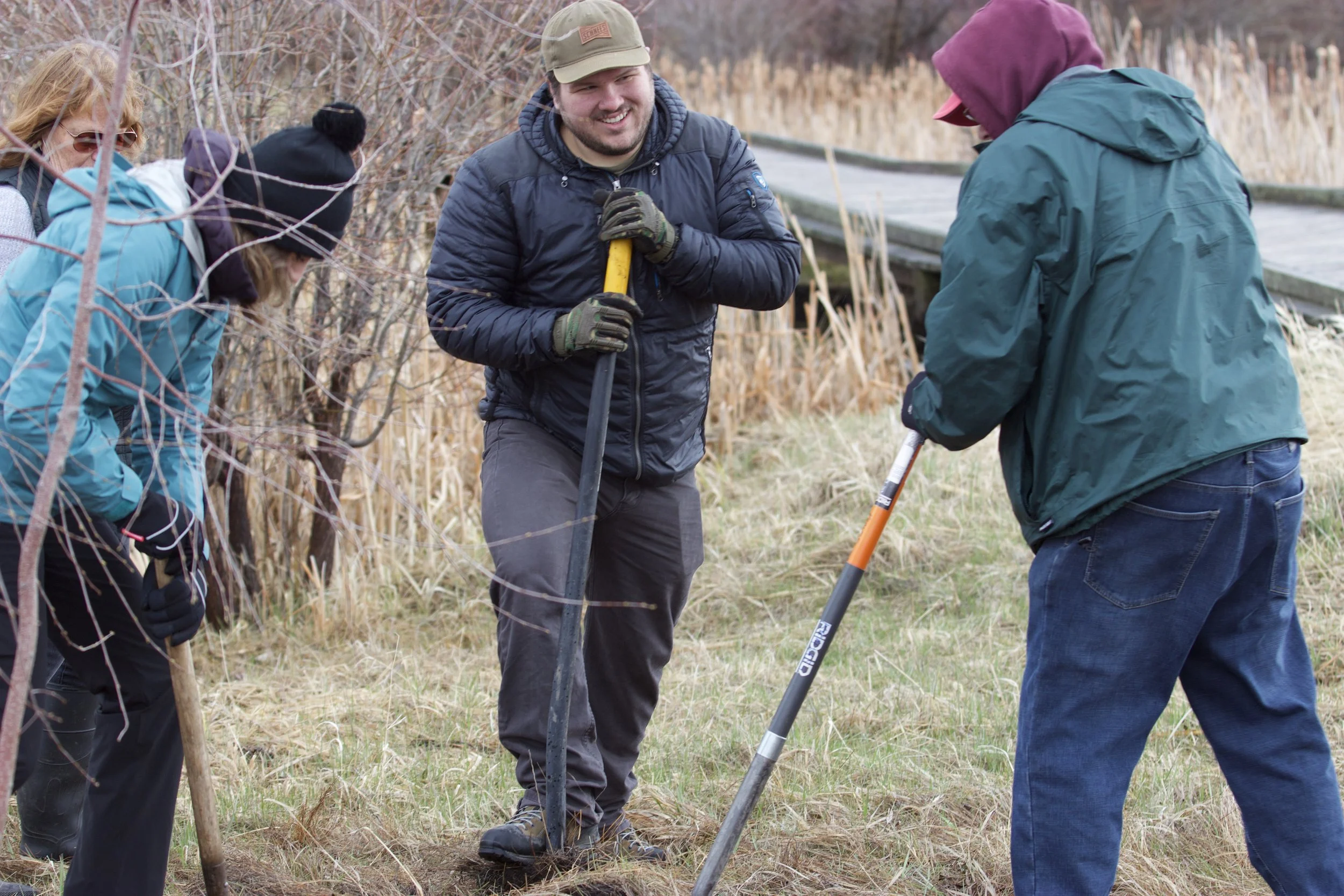Planting of locally-sourced willow cutting clusters in the Bozeman Creek Slough.