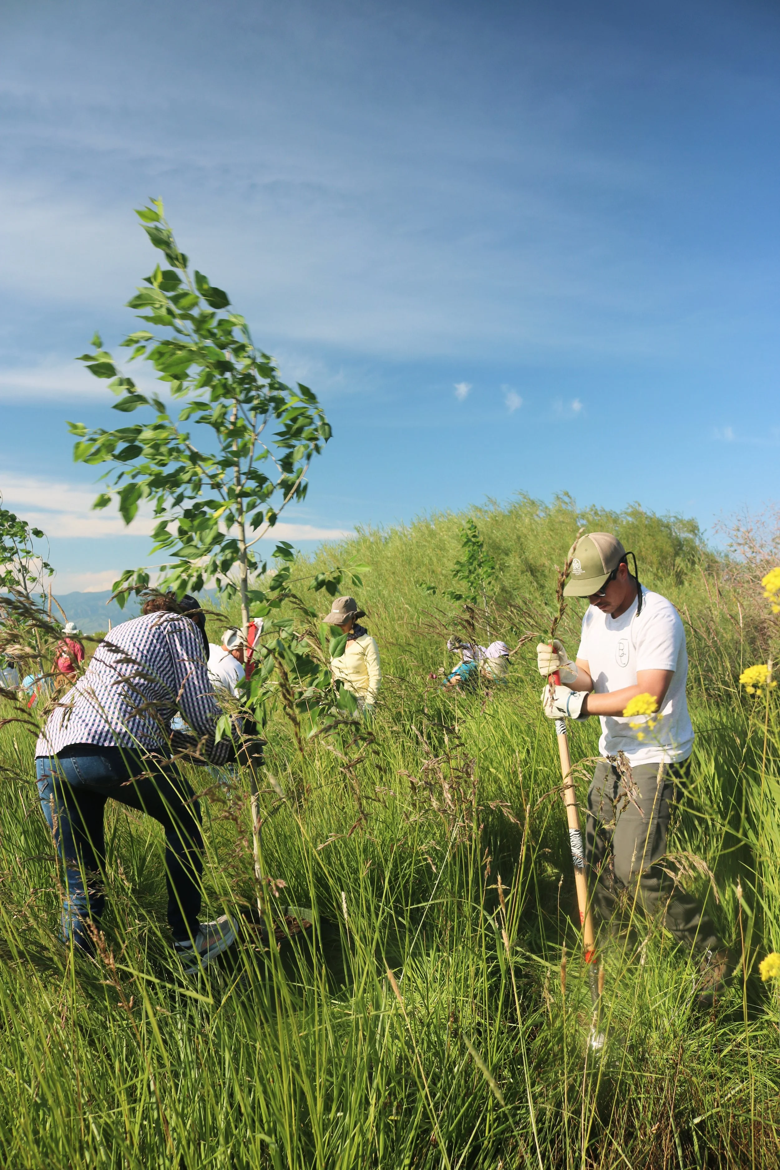 Harvest and stake willows, plant trees and shrubs, and seed grasses and wildflowers